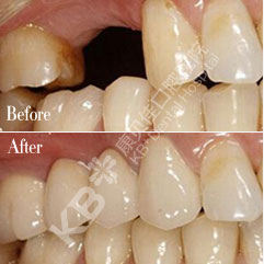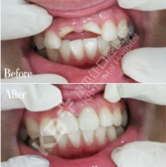 牙齿问题:门牙因车祸折断治疗方案:采用美牙冠快速修复